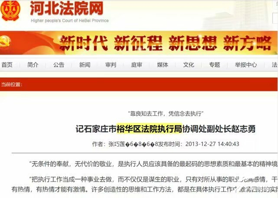 河北法院网还曾转载过《河北法制报》对赵智勇的宣传报道:《“靠良知去工作,凭信念去执行”——记石家庄市裕华区法院执行局协调处副处长赵志勇》。报道中,赵智勇不仅帮助一名骨折瘫痪的申请人拿到了15万元补偿款,还设法为他申请到2.5万司法救助金,“最后还找车护送申请执行人一家人回到了原籍。”赵智勇在执行日志中写道:“医者,当以慈悲为怀,以德为天。执行人员同样是医者,医治社会顽疾,是法律顽疾的医者,因此更应该有悲悯天下的情怀”,“靠良知去工作,凭信念去执行”。案件宣布告破后,河北法院网撤下了对赵智勇的宣传报道。