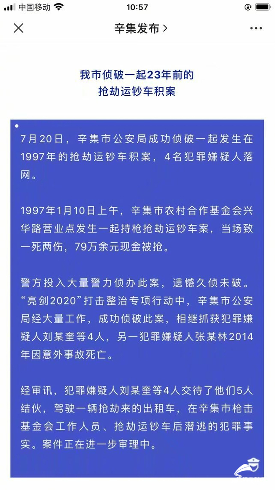 7月23日,河北辛集市官方微信公众号发布消息称,7月20日,辛集市公安局成功侦破一起发生在1997年的抢劫运钞车积案,4名犯罪嫌疑人落网。