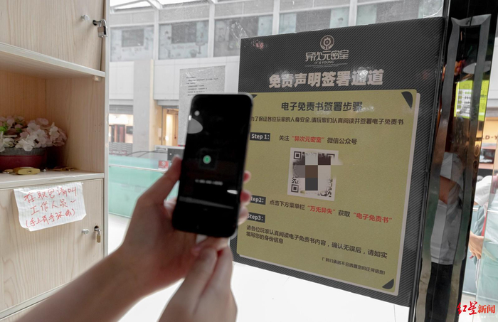 随后,记者来到异次元沉浸密室,与零异世界沉浸式剧场相同,这里也设置了多个不同的主题,部分主题设置了真人NPC。工作人员欧阳女士告诉记者,入场需要扫码填写免责声明书。记者看到,声明书上写着“玩家患有高血压、心脏病或妊娠阶段等特殊身体状况不得参与体验”“玩家本人对恐怖元素心理承受力低选择退出游戏,不得再次进入游戏区体验”等条款。