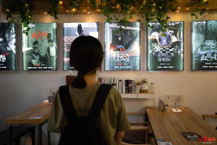 7月29日上午,记者来到春熙路第一城商场,商场内有众多密室店铺,向商场外墙拥挤的招牌中望去,密室、恐怖、沉浸式等字眼十分醒目。记者走访其中的几家密室逃脱店铺,虽然不同店铺的密室设置、剧本不同,但是宣传册中不乏有“鬼校”“怨念”“死亡”等字眼,以恐怖的背景、悬疑的故事为卖点。