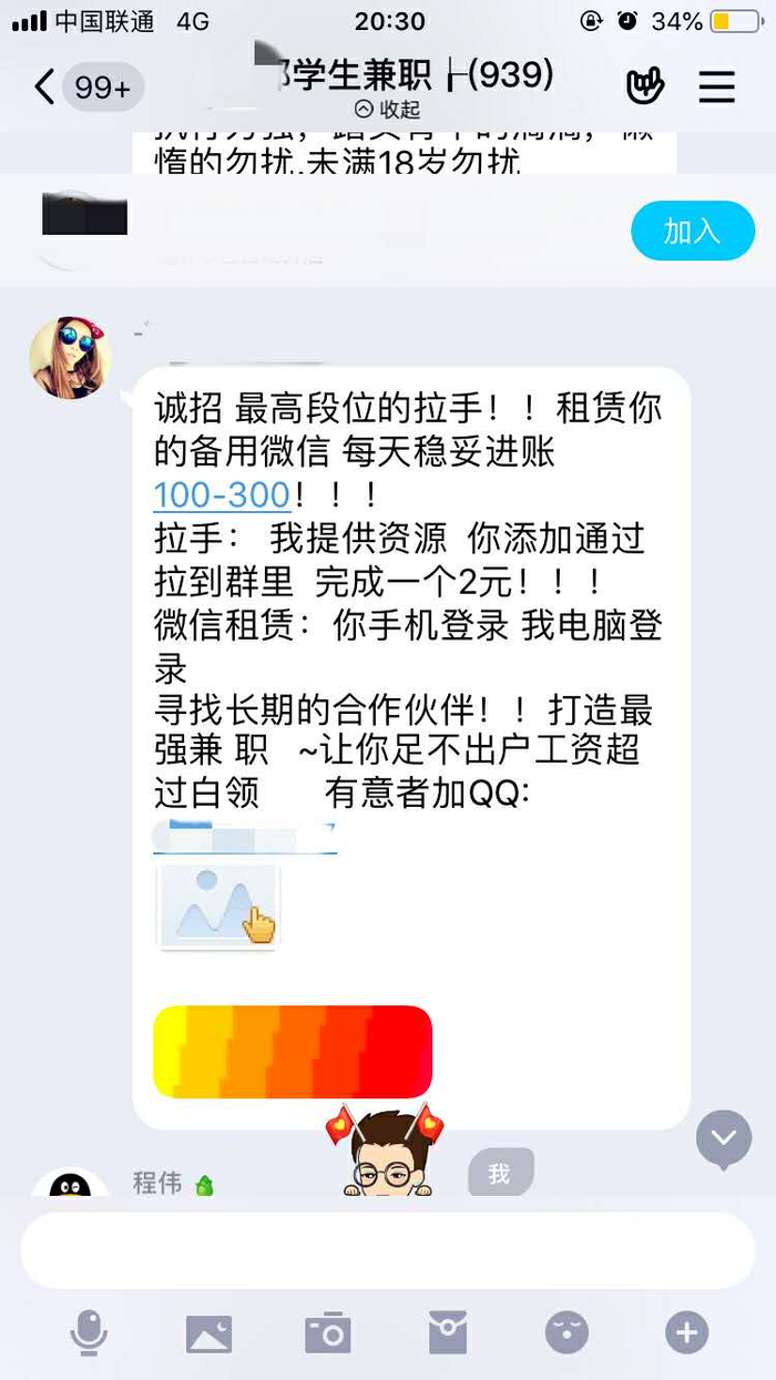 通过这名网友,新京报记者联系到其上线,对方自称是租用微信生意的老板,“这些在群里发布兼职信息的人都是我的代理,他们多数是学生。代理每招到50个人,就能赚到近千元的报酬。”