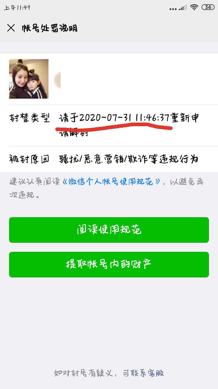 大约5小时后,群内8人账号均被官方封禁。记者的微信登录页面显示,该账号因存在骚扰、恶意营销、欺诈等违规行为被限制登录,需要申请解封,封禁时长在1至3天不等。