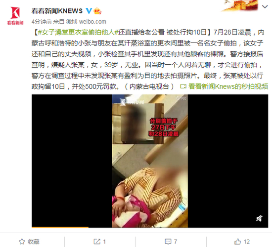 原标题:女子澡堂更衣室偷拍他人 还直播给老公看 被处行拘10日