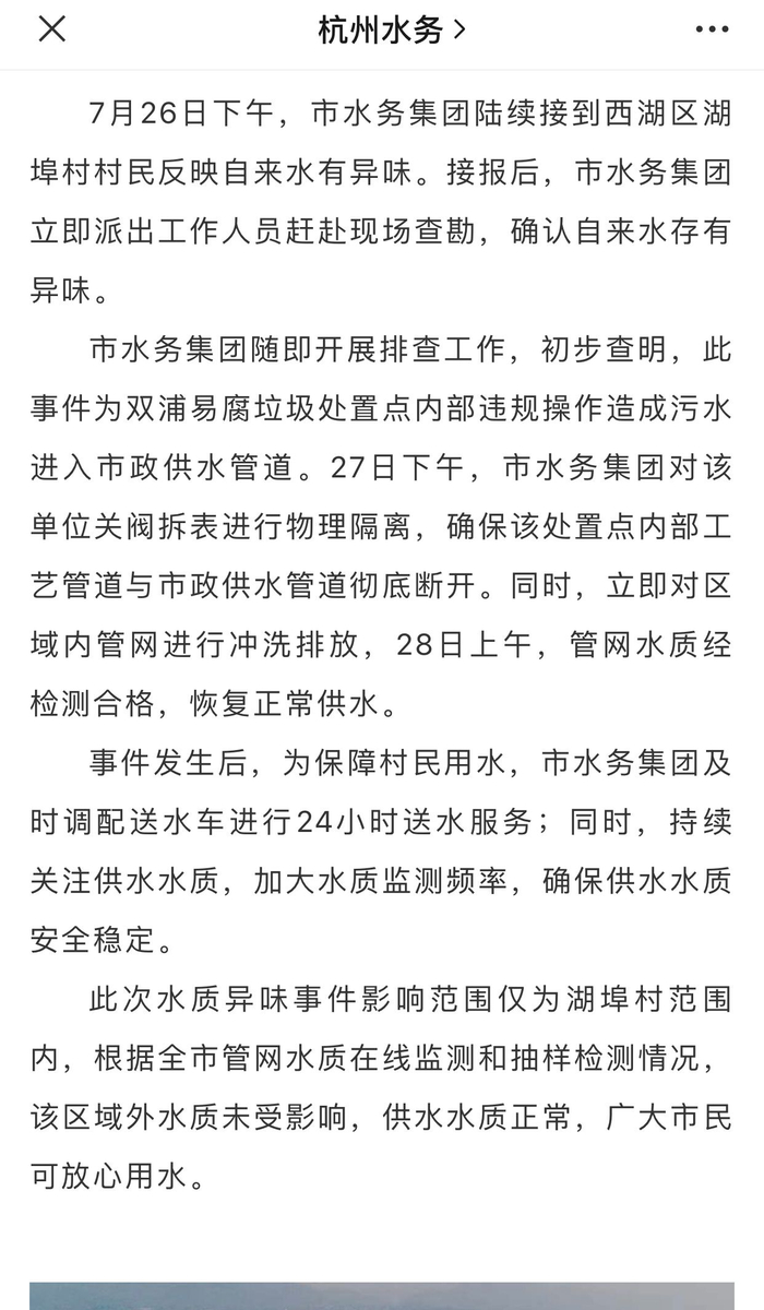7月30日,杭州市水务集团通报“西湖区湖埠村自来水异味”事件称,经查,系双浦易腐垃圾处置点内部违规操作,造成污水进入市政供水管道,目前当地已恢复正常供水。