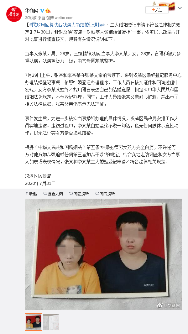 原标题:民政局回复陕西残疾人领结婚证遭拒:二人婚姻登记申请不符合法律相关规定
