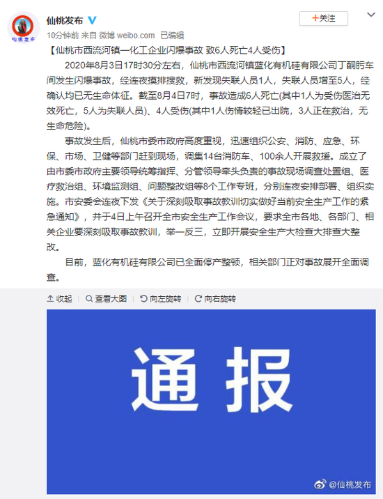 2020年8月3日17时30分左右,仙桃市西流河镇蓝化有机硅有限公司丁酮肟车间发生闪爆事故,经连夜摸排搜救,新发现失联人员1人,失联人员增至5人,经确认均已无生命体征。截至8月4日7时,事故造成6人死亡(其中1人为受伤医治无效死亡,5人为失联人员)、4人受伤(其中1人伤情较轻已出院,3人正在救治,无生命危险)。