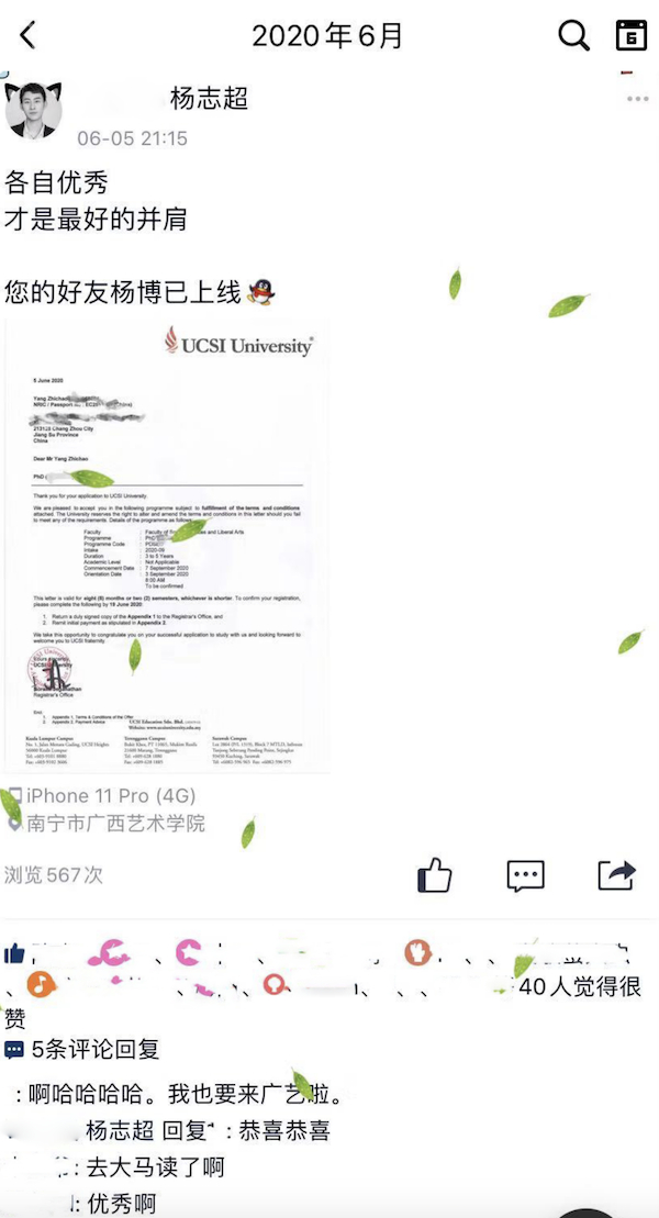 据悉,杨志超凭“挪用”获得硕士学位,举办展览走秀,接受各大媒体高校报道,并且还拿抄袭的作品作为自己研究生毕业作品,申请国外著名高校马来亚大学、斯特雅大学、世纪大学等多所院校的博士并取得offer。