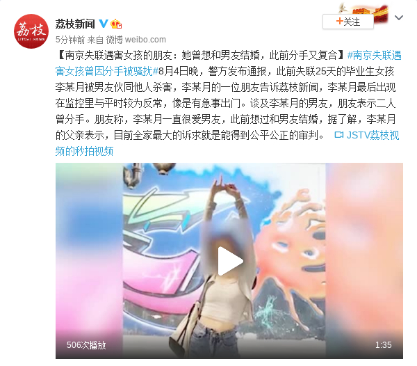 原标题:南京失联遇害女孩的朋友:她曾想和男友结婚,此前分手又复合