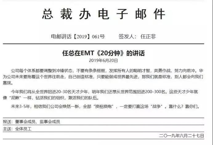 2019年6月27日,任正非在华为公司EMT(经营管理团队)内部的讲话提到,“今年我们将从全世界招20-30名天才少年,明年我们还想从世界范围招进200-300名。这些天才少年就像‘泥鳅’一样,钻活我们的组织,激活我们的队伍。”他说,“华为公司未来要拖着这个世界往前走,自己创造标准,只要能做成世界最先进,那我们就是标准,别人都会向我们靠拢。