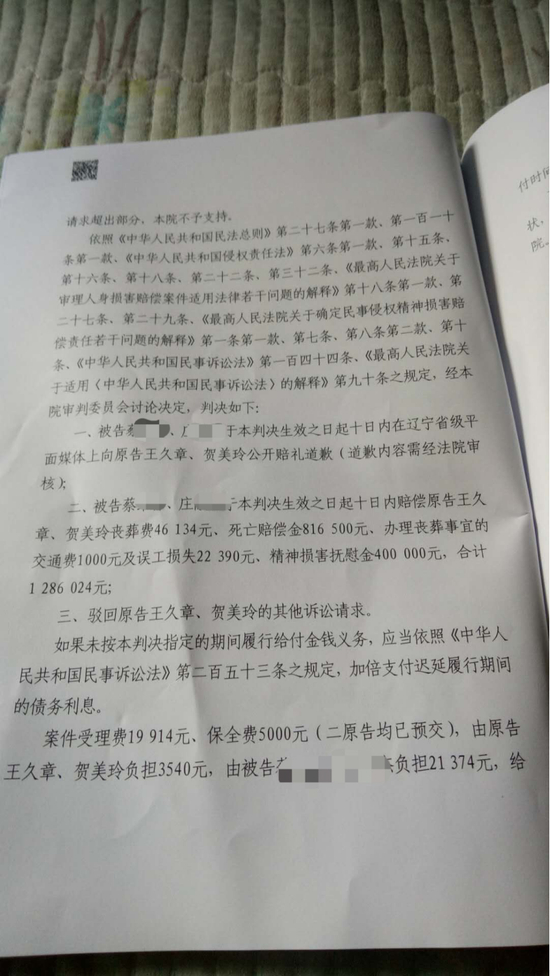 记者从琪琪家属处获得的判决书显示,大连市沙河口区人民法院判处被告蔡某某、庄某某于本判决生效之日起十日内,在辽宁省级平面媒体上,向原告琪琪母亲及家人公开赔礼道歉(道歉内容需经法院审核)。民事赔偿部分,判处蔡某某、庄某某于本判决生效之日起十日内赔偿原告合计1286024元。