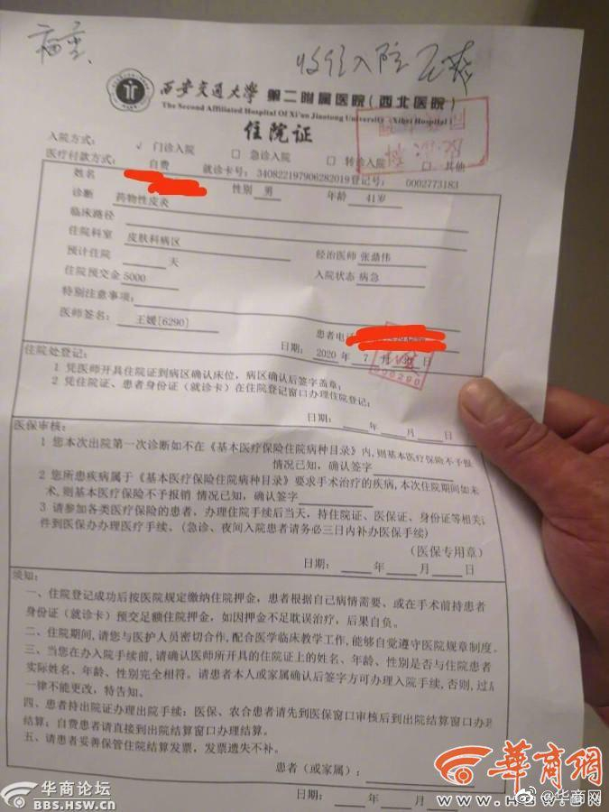 7月27日,离开医院后“求问”身上的症状没有太大好转,一直到7月30日,全身已经连片通红,并且奇痒无比。于是他前往西安交通大学第二附属医院就医,门诊诊断为“药物皮炎”,病情危重,要求马上住院治疗。