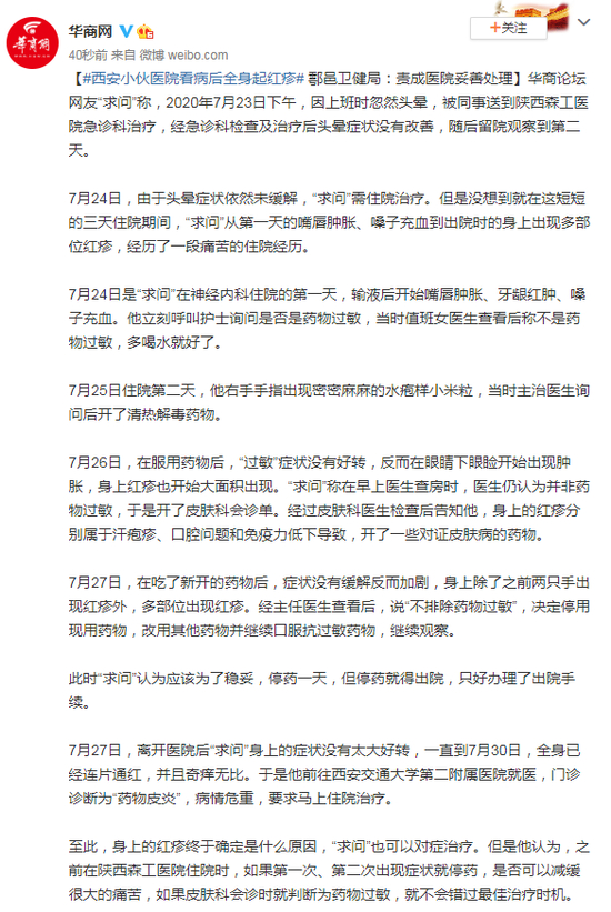 原标题:西安小伙医院看病后全身起红疹 鄠邑卫健局:责成医院妥善处理