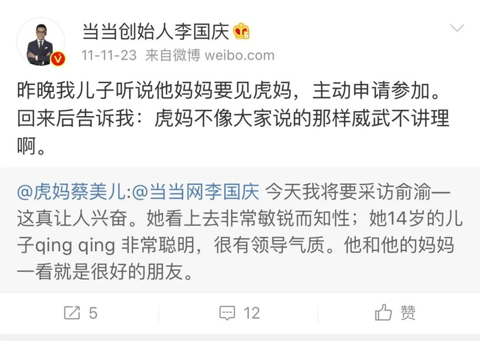 由于俞渝一直甚少在公开场合谈私事,而李国庆又是一个嘴没有把门的人,二十几年来,几乎所有关于儿子的状况,都是由李国庆嘴里透露出来的。