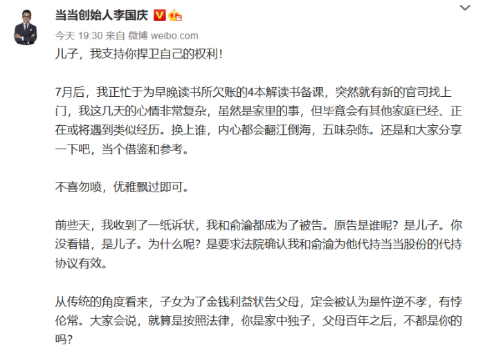 李国庆上周末在微博爆料,自己和俞渝被儿子告上了法庭,希望法院确认他们夫妻二人为儿子代持当当股份的代持协议有效。在李国庆看来,儿子“大逆不道”告爸妈背后,明显是被俞渝“当枪使了”,目的就是从夫妻二人本可以平分的股权中,拆掉一部分,成为俞渝的砝码。