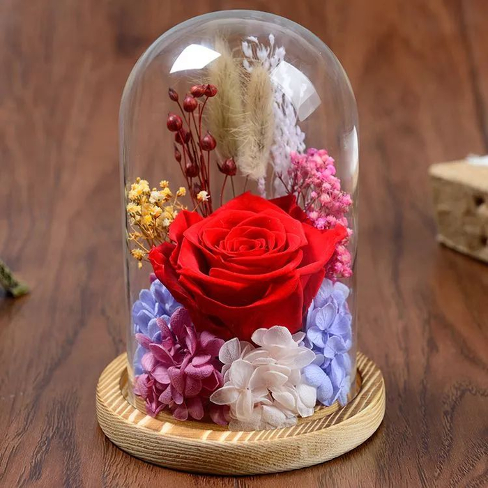 然而,他走后,女友把花瓣脱水、烘干、染色,这样制作的花永不枯萎。