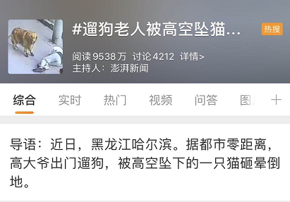 据广东广播电视台“广东公共DV现场”8月13日报道,前段时间,在黑龙江哈尔滨某小区的楼下,又发生了一起“高空坠物”事件。这次掉下的东西不是玻璃窗、酒瓶、菜刀这些东西,而是……一只猫!
