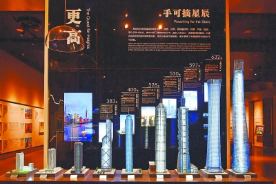 展厅的这些模型都是中国不同时期的高层建筑。最早1968年建造的广州宾馆高86米,1999年建造的上海金茂大厦高420米、2018年建造的中国尊大厦高528米、2016年建造的上海中心大厦高632米。