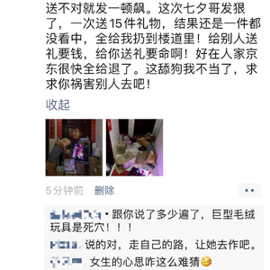是不是平时多从自己的喜好出发买礼物,没太关注女孩子的爱好?面对网友这样的疑问,小武说:“我也不太懂什么时尚和潮流,可能有些礼物在女孩看来比较土,但我是诚心的。礼物买的不好我可以退了买别的,但是把礼物扔得满楼道都是,太伤人了。”他说,没想到一冲动发朋友圈影响这么大,朋友圈他已经删了,自己想好好静一静。