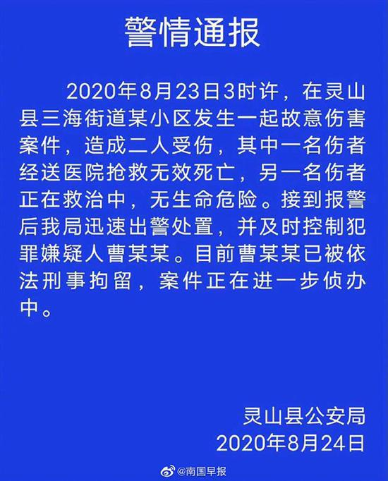 24日晚,灵山警方发布通报,8月23日凌晨3时许,在灵山县三海街道某小区发生一起故意伤害案件,造成二人受伤,其中一名伤者经送医院抢救无效死亡,另一名伤者正在救治中,无生命危险。接到报警后灵山县公安局迅速出警处置,并及时控制犯罪嫌疑人曹某某。目前曹某某已被依法刑事拘留,案件正在进一步侦办中。
