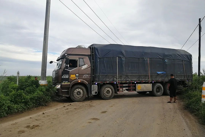 雨势正大,道路狭窄,路两侧又是湿地和芦苇荡,十几米长的货车想要掉头非常困难。第一辆货车在“小河分场”门口倒车掉头,进一点,退一点,引擎轰鸣,车轮在地面上拧出一片泥浆,厂里很快有人出来制止。