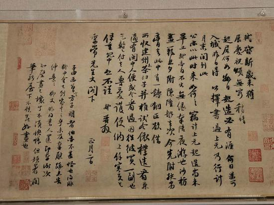 漫步展厅,随意驻足都有看点。展柜中,苏轼《治平帖》铺陈展开,这封信的主要内容是委托乡僧照管坟茔之事。根据帖后赵孟頫、文徵明、王穉登三人题跋可知,这是苏轼三十多岁时在京师时所作。纸面上,一笔一划,笔法精细,字体遒媚,正如赵孟頫所称“字画风流韵胜”。