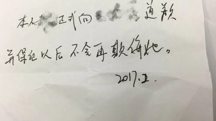毛女士记得,戴某对女儿的最后一次出格行为,在2017年春节返校后,戴某将晓月搂在腿上,摸胸、摸下体。这一次,晓月似乎终于下定决心,在离开办公室后,给戴某打了电话,说以后再有这样的行为,就告诉戴某的老婆,并要求戴某写下保证书。毛女士是在之后和女儿的通话中知道这件事的,她看到了戴某发给女儿的保证条,上面写着“本人戴某正式向晓月道歉,并保证以后不再欺侮她。2017年2月。”