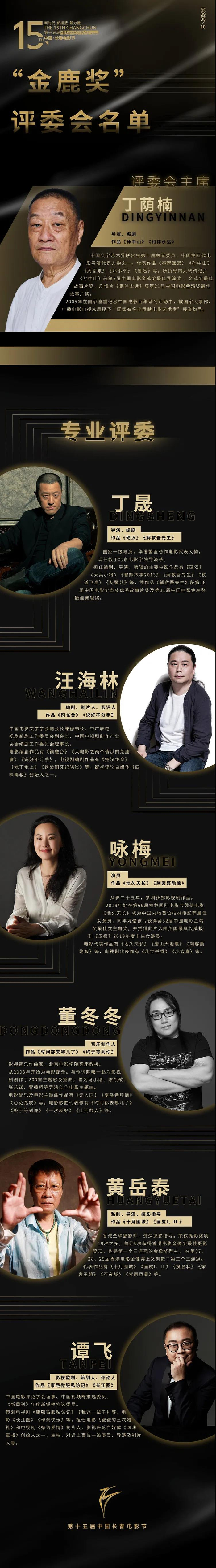 第十五届中国长春电影节“金鹿奖”评委会主席及评审团成员名单,由著名导演丁荫楠担任本届“金鹿奖”评审主席,由著名导演丁晟、著名编剧汪海林、著名演员咏梅、著名音乐制作人董冬冬、著名摄影师黄岳泰、著名影评人谭飞共同担任专业评委。