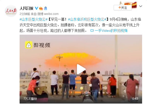 9月4日傍晚,山东临沂天空中出现巨型火烧云。拍摄者称,云彩很有层次,像一座火山从地平线上升起,场面十分壮观,路过的人都停下来拍照。