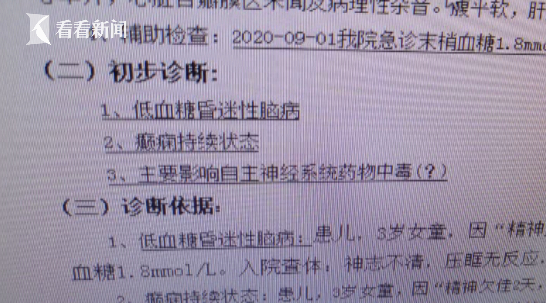 接诊医生,南方医科大学深圳医院儿科主任医师张玉明向记者描述了当时的情况:“患儿送到急症时候已经昏迷了,然后我们就询问病史,家属提供了一个线索,说爷爷平时吃的降血糖药少了一些,我们马上联想到这个小孩是误服了降血糖药。所以我们立刻对她进行血糖测定,结果血糖测定令我们大吃一惊,竟然低到测不出来,所以很快确诊是低血糖昏迷。”