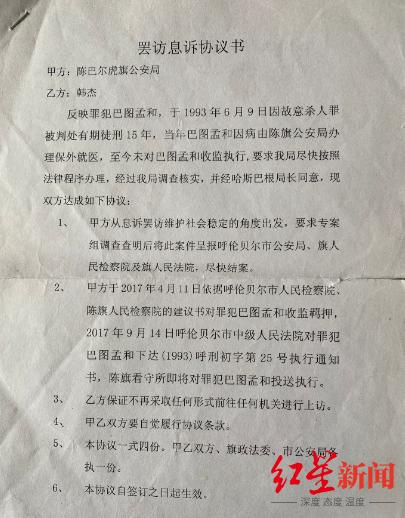 一份由韩杰提供的罢访息诉协议书显示,2017年9月20日,陈巴尔虎旗公安局与韩杰就巴图孟和未收监一事达成协议,陈巴尔虎旗公安局称要求专案组调查查明后将此案件呈报呼伦贝尔市公安局、旗人民检察院及旗人民法院,尽快结案。而韩杰保证不再上访。