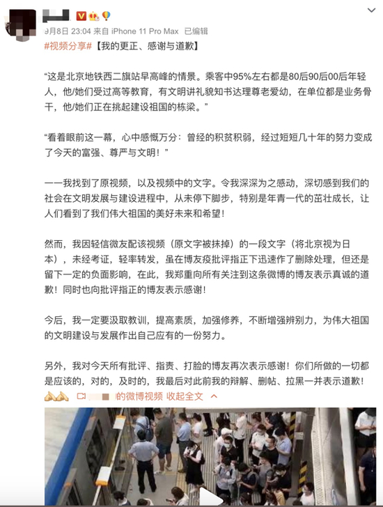 直到8日23时许,无法继续嘴硬下去的博主B终于发文道歉了,他承认自己此前所发“地铁里秩序井然”的视频是北京西二旗地铁站的画面,而非东京的新宿站。