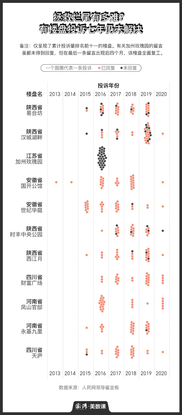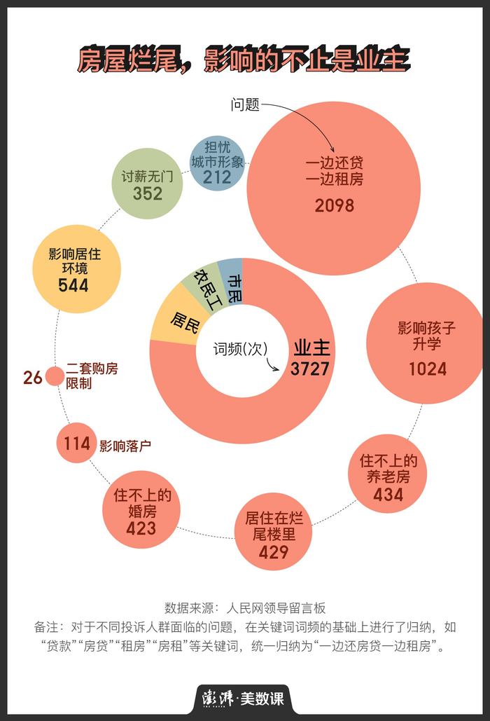 在人民网创立的国内唯一全国性领导干部留言板“领导留言板”上,10年间共有8千多条与“烂尾”有关的留言投诉,与住房烂尾直接相关的投诉共7478条,涉及楼盘超过3188座。其中,至少429条留言提到自己或他人有居住在烂尾楼中的情况。