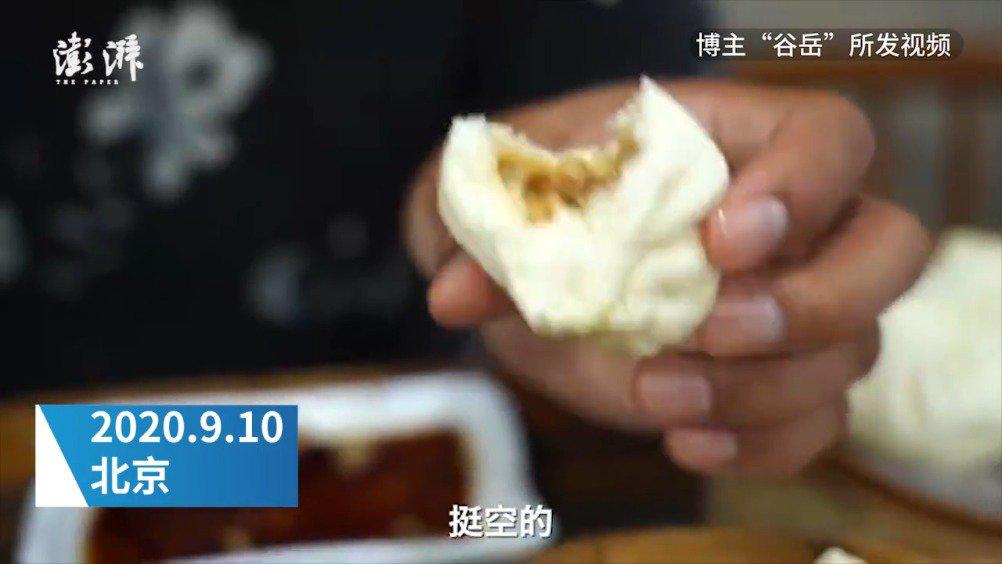 品尝过猪肉包后,谷岳说,“肉馅确实有点少,基本上和吃半个馒头似的。”视频中,他称两屉包子“吃了一下,实在吃不下去了。”不过,他也表示,“没有那么难吃”,并认为“这种质量20块钱差不多了,100块钱两屉有点贵。”