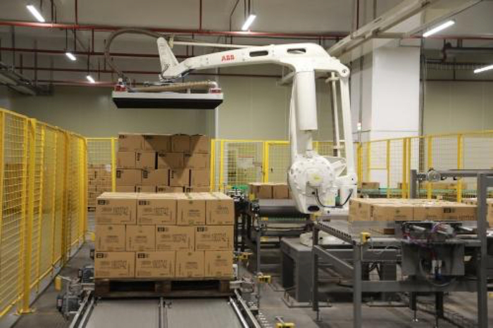 在无人车间,拥有机械臂的码垛机器人有序高效地将产品装进箱子,自动喷码机器则协助着进行箱子的喷码工作,AGV转运车也在车间里充当搬运的好帮手,机器人们互相协作,完成了产品从包装到装运到车的全部工作。