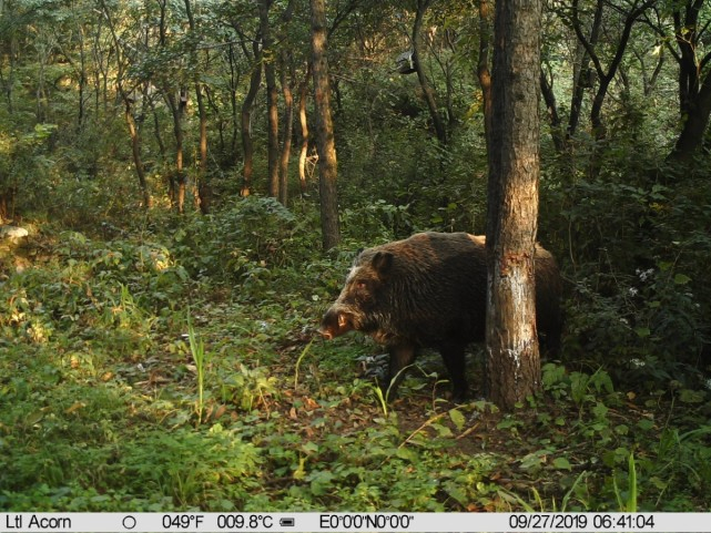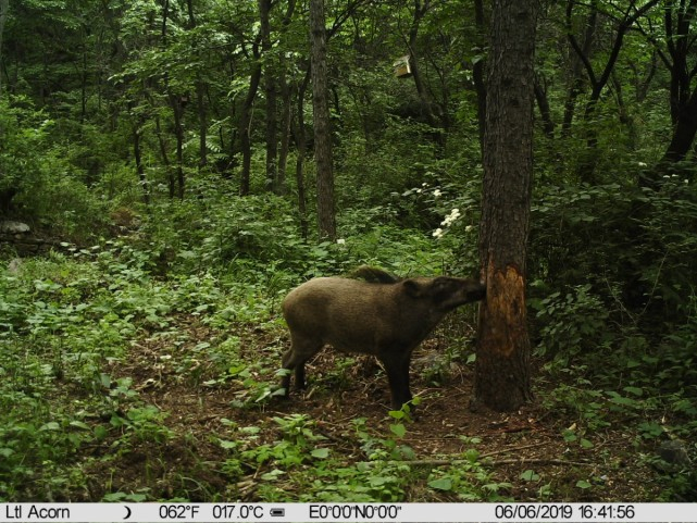 “蹭痒是因为皮肤上有寄生虫,有的野猪有自己固定的蹭痒树,树皮都被它们蹭掉了,油松皮一开裂会渗透出树脂,野猪蹭到身上正好可以护理皮毛,聪明着呢。”