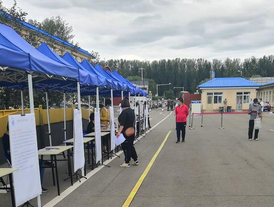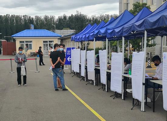 遮阳伞、办公桌、广告牌,预约、扫健康码、进场——一场露天线下招聘会,上周五在顺义区人力资源市场院内展开。