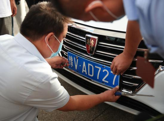 上午8点50分,市车管所工作人员把第一张豫v号牌挂在了侯先生一辆白色荣威轿车上。