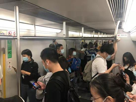 周二早上8点半,记者来到4号线北京南站站台,此时等待上行方向列车的乘客正在有序排队,每个屏蔽门前都有10名以上乘客。一辆列车进站后,车门打开,车厢内站立乘客已经贴到门前,下车乘客腾出的地儿,显然无法满足上车乘客需求。记者观察发现,候车乘客至少要等待两趟才能上车。
