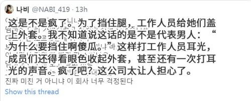 据《朝鲜日报》9月17日报道,7日直播时,为防止走光,两位女团成员刚接过队友递来的外套盖在腿上,背景中就出现了一位男性的斥责声:“盖什么?就是要露出来啊,给别人看腿啊,你傻吗?”女艺人听后看眼色将外套移开。