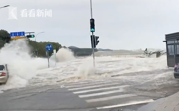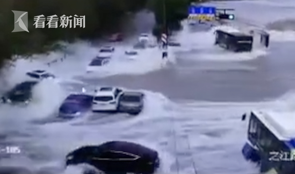 视频|钱塘江潮水涌上行车道 十几辆车子被冲走...