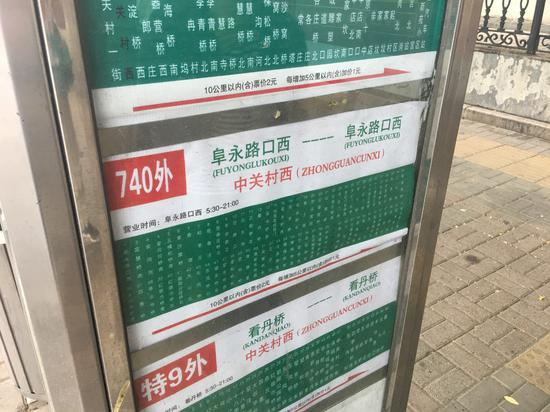 记者在中关村西站看到,740路外环车的站牌,只有以阜永路口西为终点这一版本,旁边找不到公益西桥线的任何提示或说明。只有当车辆进站时,乘客才能区分来的到底是哪趟车