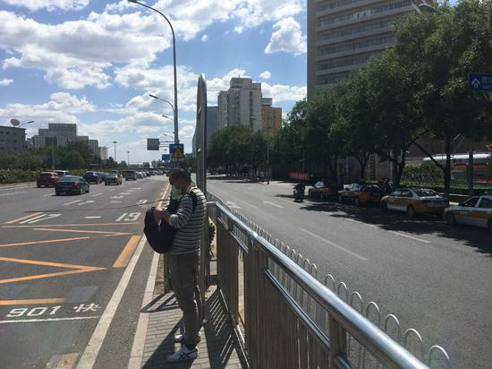 顶着大中午的烈日走上走下,还是没能找到乘车点位置。正在于先生疑惑之时,一辆901路快车沿着西三环主路由北向南驶来。只见它开过了300路外环公交的站台继续向南,又开过了天桥,最终缓缓停在了天桥南侧100米左右的位置。原来站台在那个地方!而此时,于先生正身处辅路,根本来不及跨过天桥跑到主路上乘车。