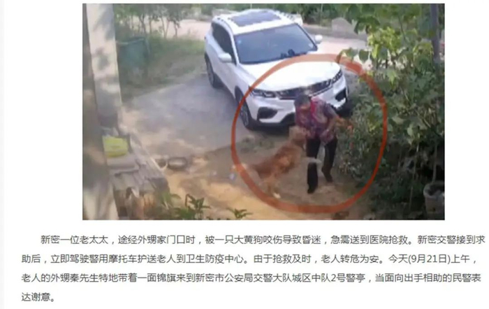 9月15日,郑州市新密市一位老太太,途经外甥家门口时,被一只大黄狗咬伤导致昏迷。