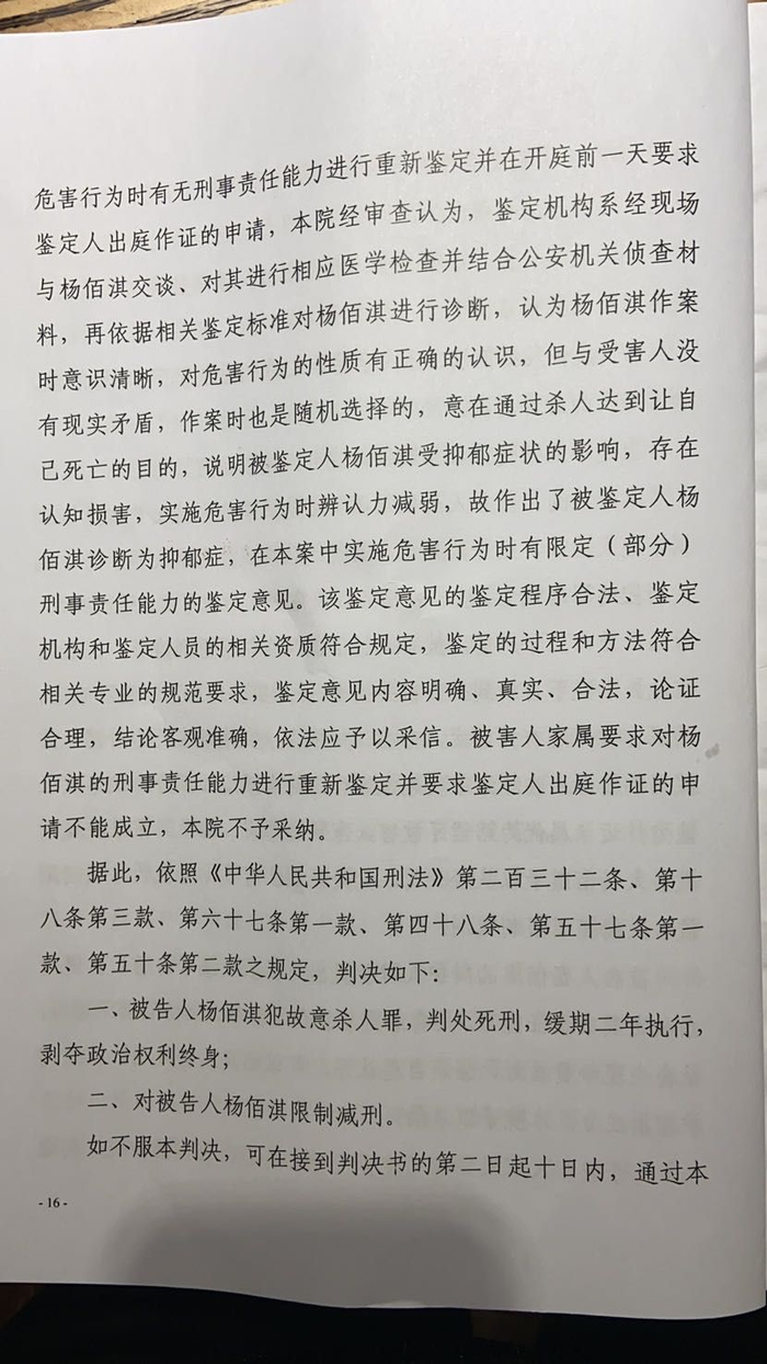 在宣判一审结果后,常德市中级人民法院官网9月24日发布消息称,该院认为,杨佰淇故意杀人动机卑劣,手段残忍,后果严重,应予严惩。案发后,杨佰淇主动到公安机关自首,近亲属代为赔偿了丧葬费,经鉴定杨佰淇在实施危害行为时有限定(部分)刑事责任能力。因此,作出上述判决。