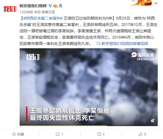 9月25日,被称为“陕西反杀案”的王浪故意伤害案二审宣判,王浪获有期徒刑五年。2017年12月,王浪在泾阳一酒吧被喝过酒的李某挑衅。李某推搡王浪,并两次递酒瓶给王浪让其砸他,王浪举起酒瓶反击,李某最终因失血性休克死亡。2018年6月,咸阳中院以犯故意伤害罪一审判处王浪有期徒刑九年。