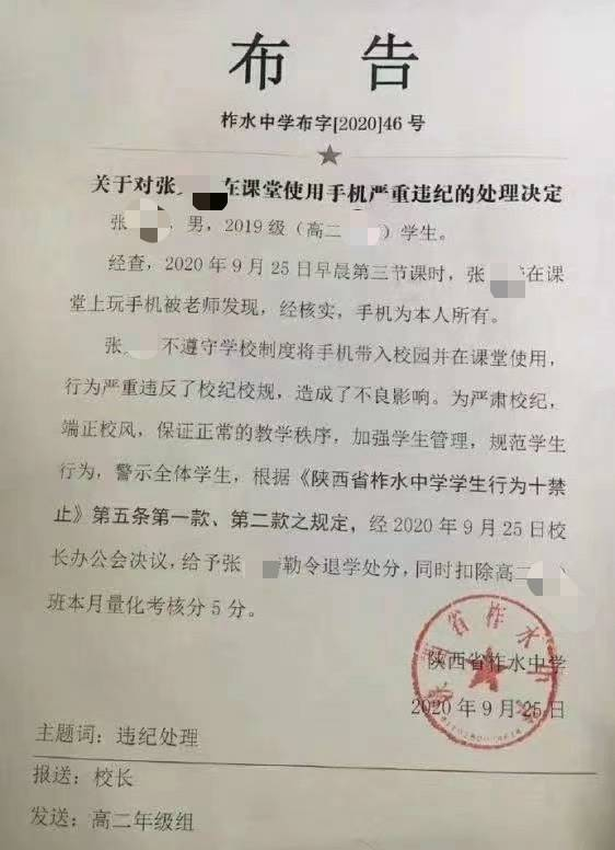 时隔三年后,该校对学生在课堂使用手机被勒令退学的规定同样引发热议时,学校曾回应相关处理决定是按照《陕西省柞水中学学生行为十禁止》第五条第一款、第二款之规定,并无不当之处。