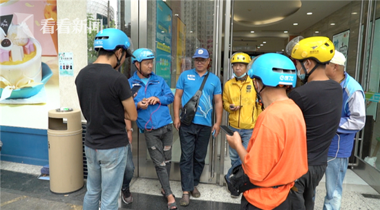 上午11点,午间用餐高峰即将来临。美食城门口聚集了许多外卖骑手。他们三五成群,聊天时也不忘频频刷新手机界面。