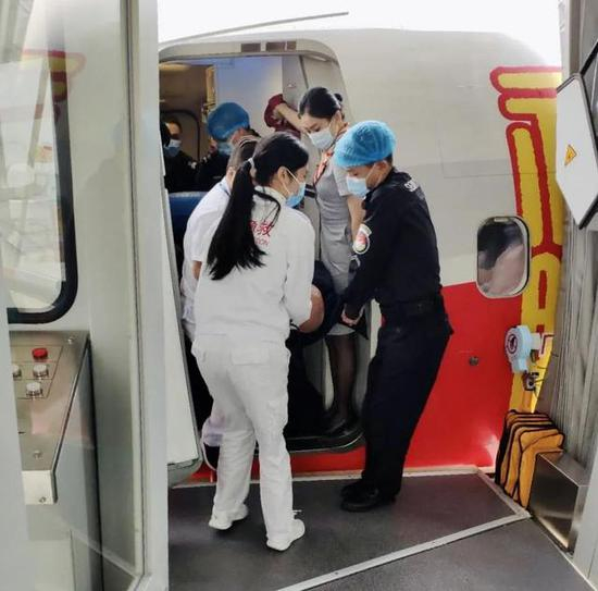 在返航下降的过程中,旅客逐渐恢复意识,但仍然无法正常开口讲话。7:57航班顺利降落赣州,机组人员迅速配合等候在机场的医务人员将旅客送上救护车、送往医院进行进一步的专业救治。