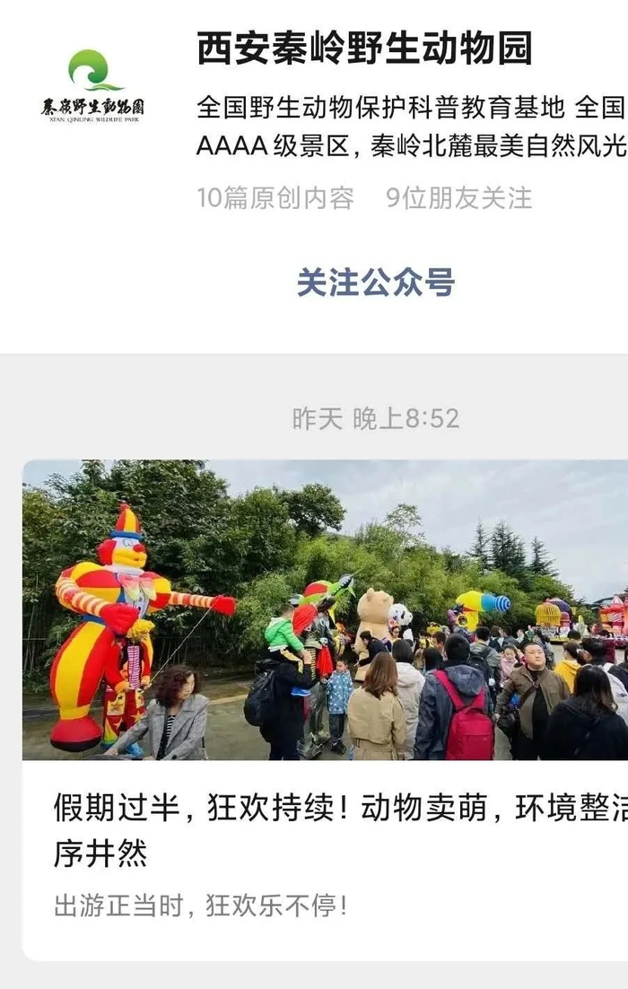 西安市民张先生今天(10月6日),本来打算趁着放假带孩子去西安秦岭野生动物园游玩,出发之前,想在百度上搜索看看有没有什么亲子活动。