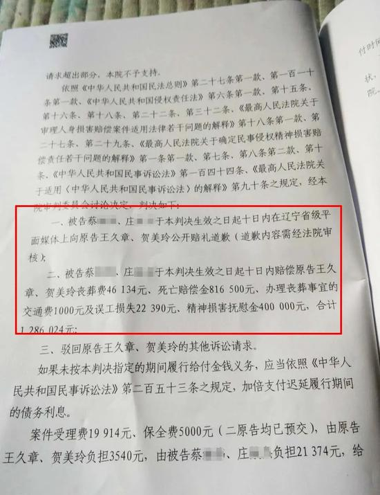 今年8月10日,大连13岁男孩蔡某杀害10岁女孩一案复庭宣判。大连市沙河口区人民法院判决被告蔡某的父母蔡伟夫妇十日内在辽宁省级平面媒体上向贺美玲、王久章夫妇公开赔礼道歉,并赔偿贺美玲夫妇丧葬费、死亡赔偿金、交通费及误工损失、精神损害抚慰金共计1286024元。